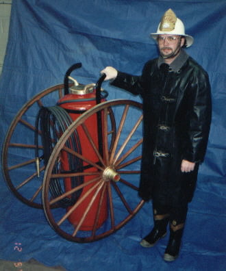 This 30 gallon wheeled soda acid extinguisher was probably the first fire apparatus in Depauville. It was located at the sawmill, and reportedly fought several fires in its day.